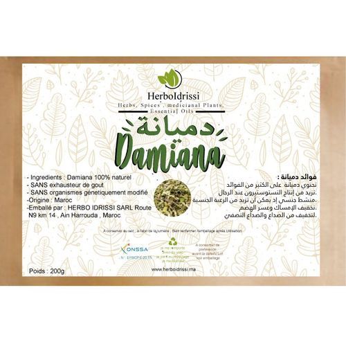 Damiana 150gr – ( Turnera diffusa ) Endurance , Libido, Energie La Damiana aussi appelée Turnera diffusa ou Turnera aph-rodisiaca est un arbuste originaire d’Amérique. Ses feuilles à l’odeur très aromatique, longtemps utilisées par les Mayas, sont reconnues pour leurs vertus aphr-odis-iaques, toniques et diurétiques.Les flavonoïdes présents dans la Damiana stimulent la circulation sanguine et la production de testostérone augmentant le désir et la puissance sexuelle ainsi que les performances sportives.Elle est efficace non seulement chez l’homme en cas d’éjaculation précoce, mais également chez la femme, grâce à son action régulatrice des déséquilibres hormonaux, troubles menstruels et d’aménorrhées (absence de règles).Ses propriétés favorisent également une meilleure récupération après l’activité sexuelle.En plus de ses actions antiseptiques et diurétiques, c’est un excellent tonifiant qui soulage l’angoisse et le stress.Principalement connue pour ses propriétés aph-rodis-iaques, la damiana (Turnera diffusa) était traditionnellement utilisée par les Mayas. Des études scientifiques expliquent cette action aph-rodisi-aque de la damiana par ses composés bioactifs. Son contenu en flavonoïdes présente une activité anti-aromatase (1,2) (l’aromatase est une enzyme responsable de la conversion des androgènes en œstrogènes) qui est associée à une augmentation de la testostérone dans le sang et au maintien de l’énergie, de la force, de la libido et de la masse musculaire chez les hommes d’un certain âge (1).