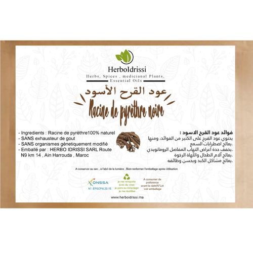 Les Racines de pyrèthre ( عود العطاس) est une plante aromatique est médicinale. Au Maroc,. Le pyrèthre peut éventuellement être utilisé pour soulager les rages de dent et les maux de gorge. En bouche, la plante fait ressentir qu’elle contient des huiles essentielles par une sensation de picotement sur la langue et a la particularité de faire saliver, d’où son autre nom de « Salivaire ». Le pyrèthre aurait aussi des vertus dépuratives, digestives et psychotoniques.